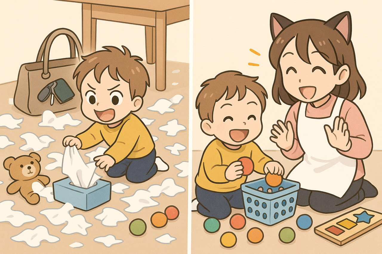 お気に入りのおもちゃも、ママのバッグの中身も、気づけば彼の冒険の舞台になっていました。